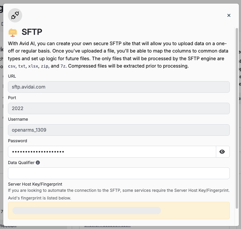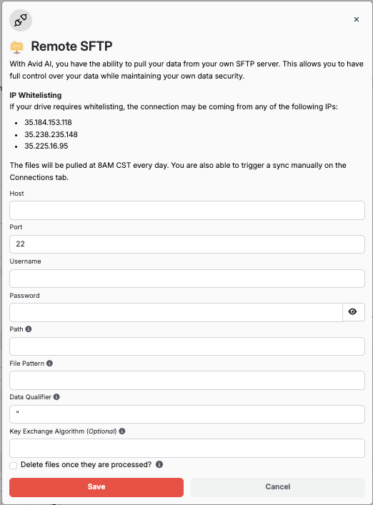 SFTP is a reliable way to move data into Avid AI without relying on manual uploads or unsecured transfers. Many organizations generate reports or exports daily from internal systems, and having an automated pipeline ensures that this data is delivered consistently, securely, and on time. By connecting SFTP, you reduce the risk of human error, avoid delays from manual file handling, and guarantee that sensitive data moves over encrypted channels. Once the connection is established, every file delivered through SFTP is automatically picked up, processed, and included in your data blend, so your team always has the freshest information without extra effort.