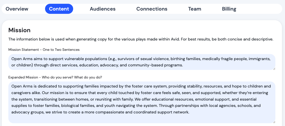 Everything Avid learns about you is documented in your Organization Settings—and it powers how your campaigns are built in Playbooks.