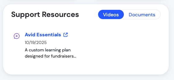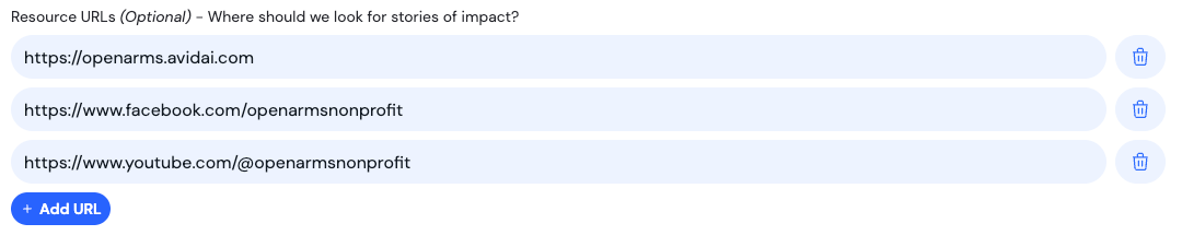Add resource URLs to show Avid where to look to find the latest stories of impact, donor resources, blogs, podcasts, and more.