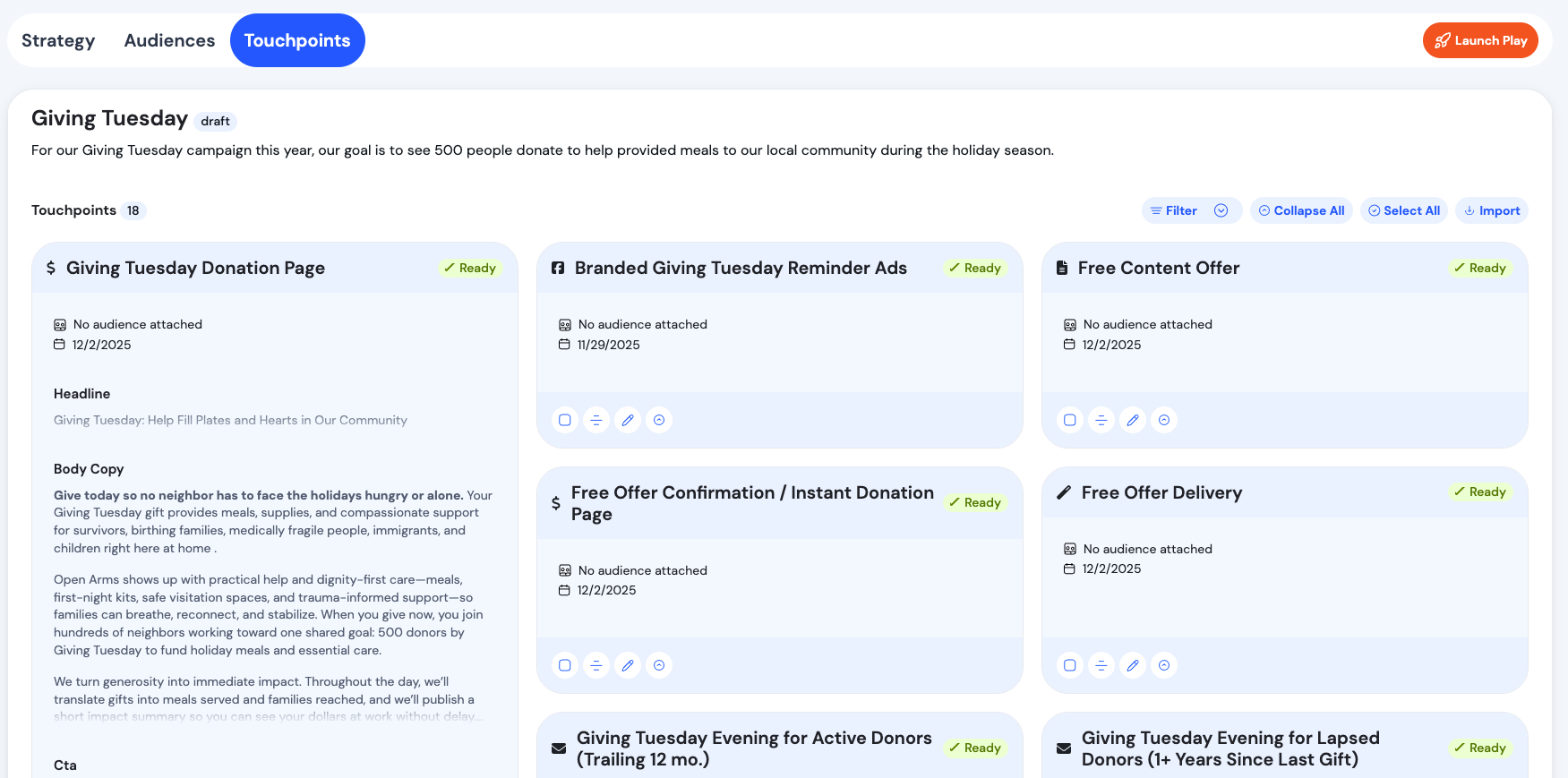 Hit the “Launch Campaign” button to finalize all your touchpoints. If you’re deploying to Mailchimp, Hubspot, or Meta / Facebook Ads, Avid will set up all your touchpoints for you.