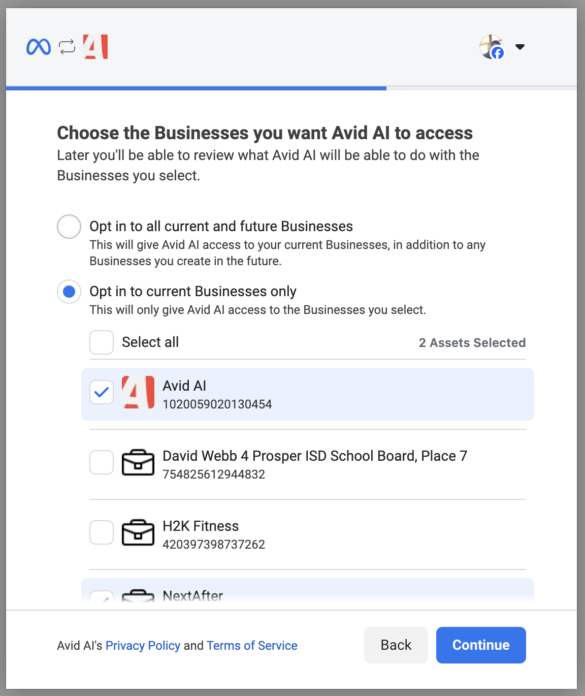 You see Choose the Businesses you want Avid AI to access.