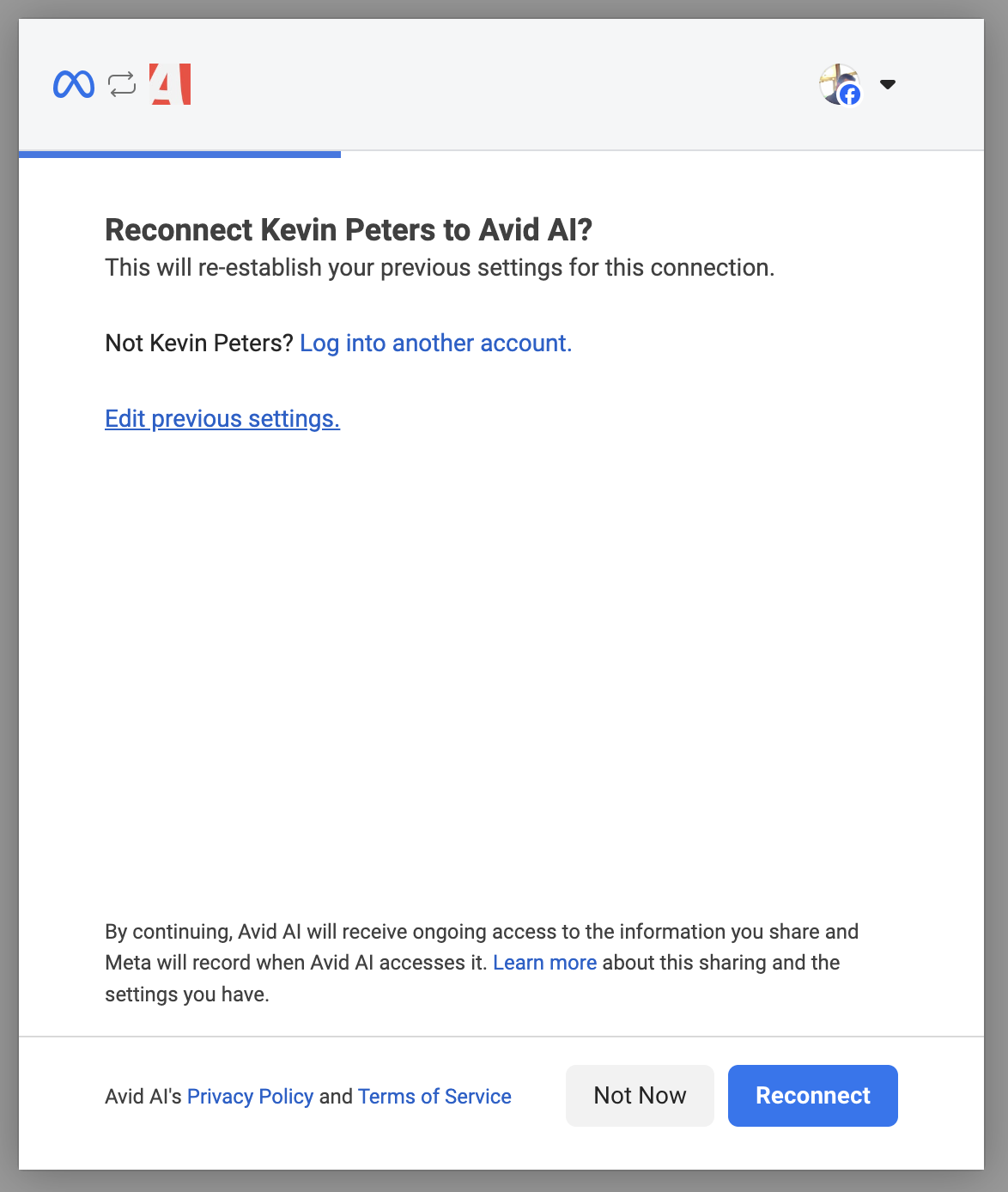 Click Continue, then Reconnect (or complete the flow). Facebook saves your selection and returns you to Avid. In Avid, open your Launch screen. Refresh the page. The Page now appears in the deployment list.