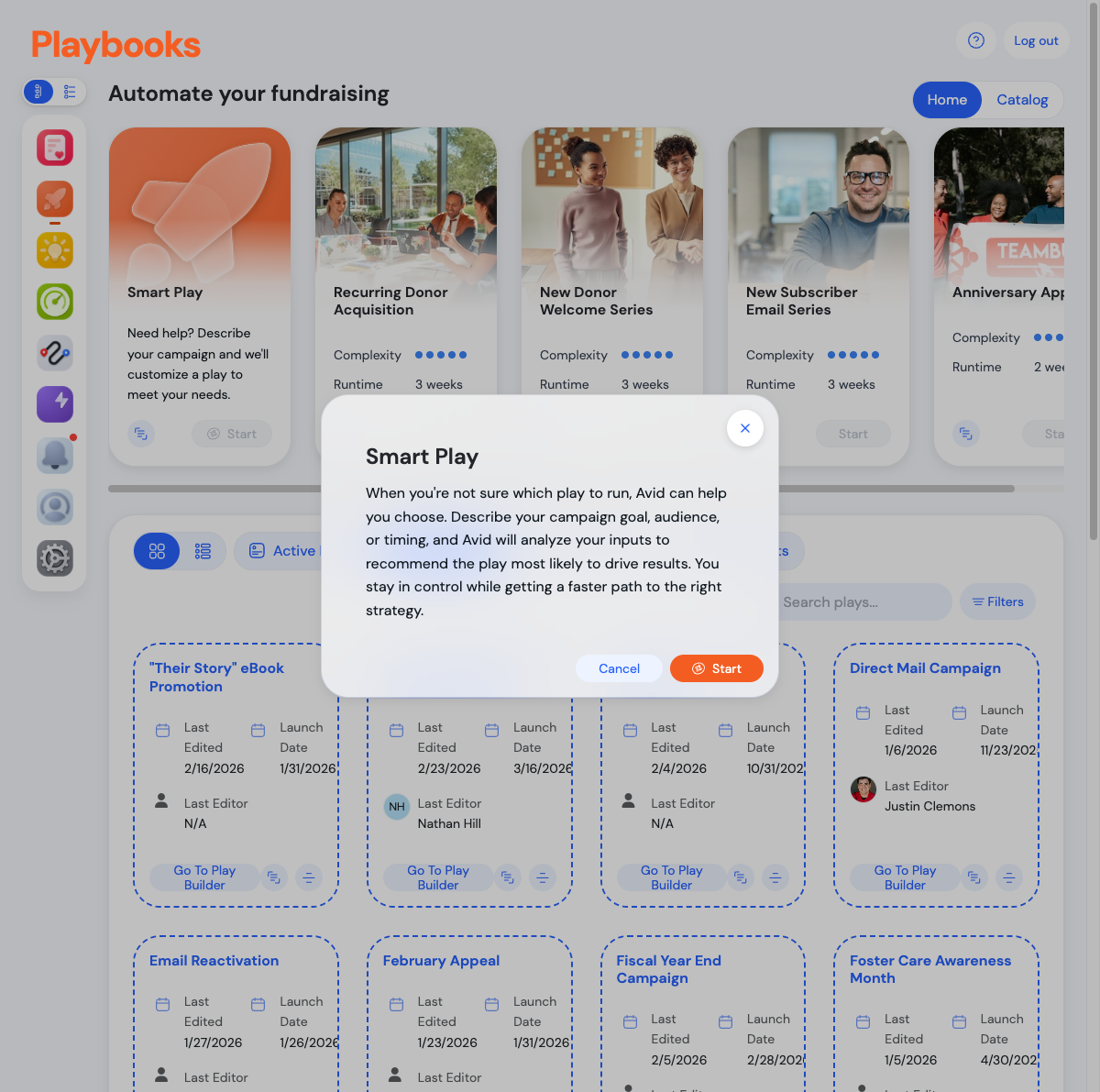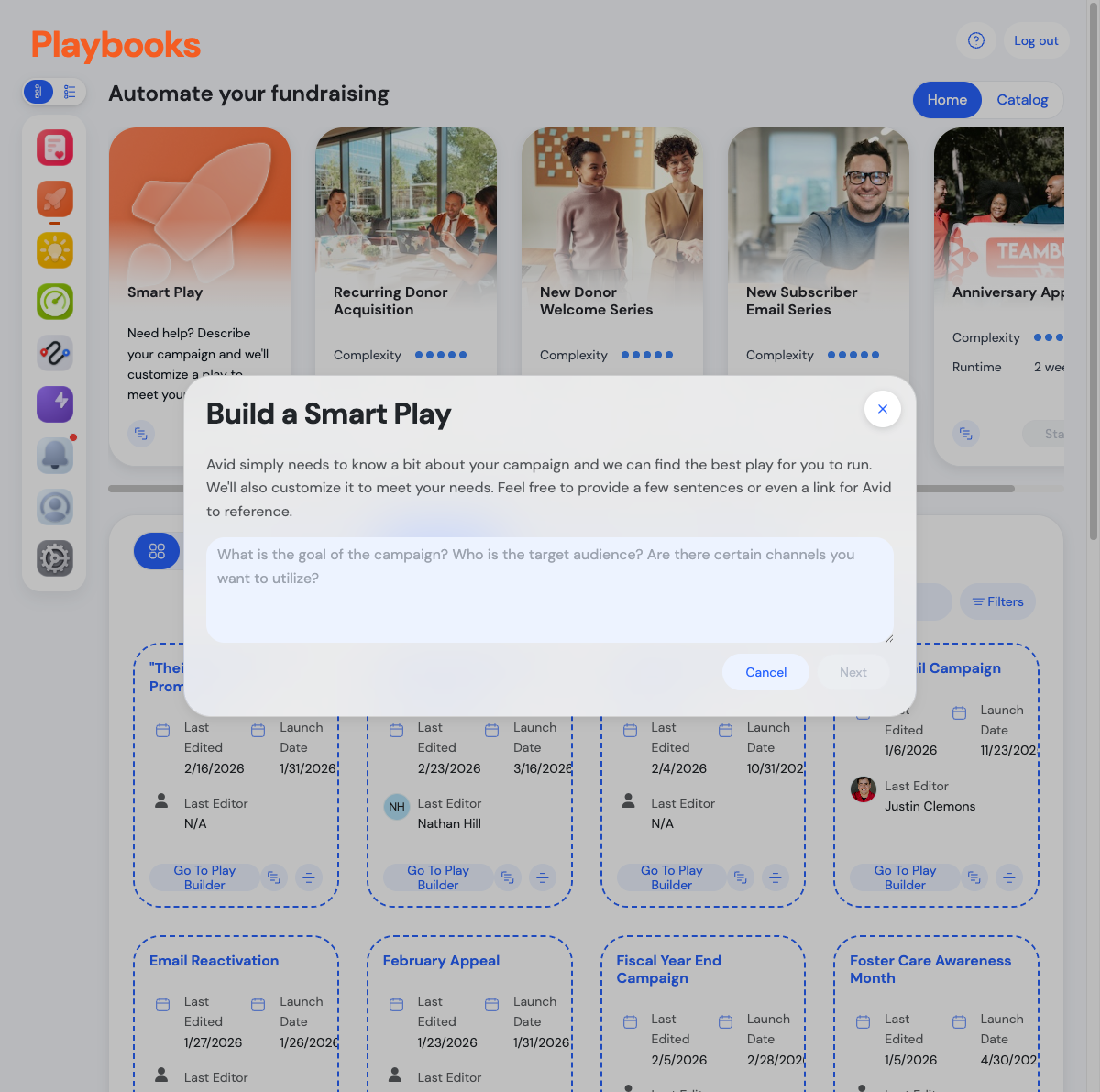 Avid AI can recommend any play type in the Avid catalog, including Anniversary Appeal, Lapsed Donor Reactivation, Year-End Digital Fundraising, Giving Tuesday, New Donor Welcome Series, Recurring Donor Acquisition, and many more. Each play type has a focus area (Acquisition, Retention, Reactivation, Upgrade, or Awareness), complexity rating, and estimated runtime. Avid AI uses your campaign description to match against these templates. If no strong match exists, Avid AI falls back to the General Marketing Campaign play type and tailors the strategy prompts to your specific goal. You can browse all available types on the Catalog tab of the Playbooks page.