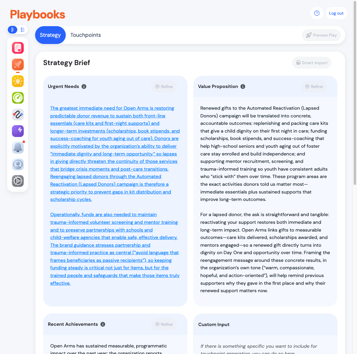 - You want AI-generated strategy content (key messages, campaign overview) for a new play.