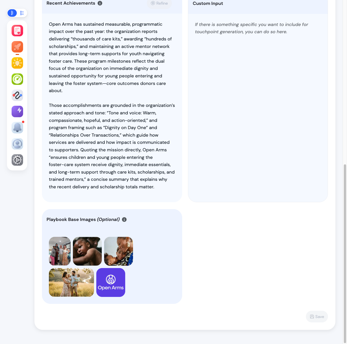 Below the strategy prompts, you can also add Custom Input text for touchpoint generation and upload Playbook Base Images that serve as starting points for AI image generation.