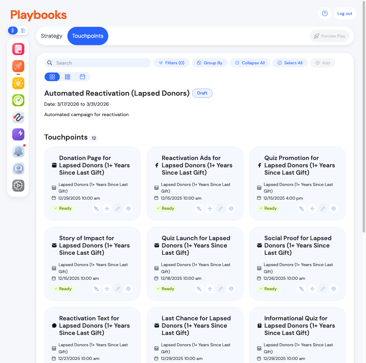 - A Touchpoints tab with all campaign assets (emails, ads, text messages, donation pages, quizzes) organized in a grid view. Each touchpoint shows its target audience, launch date, and status.