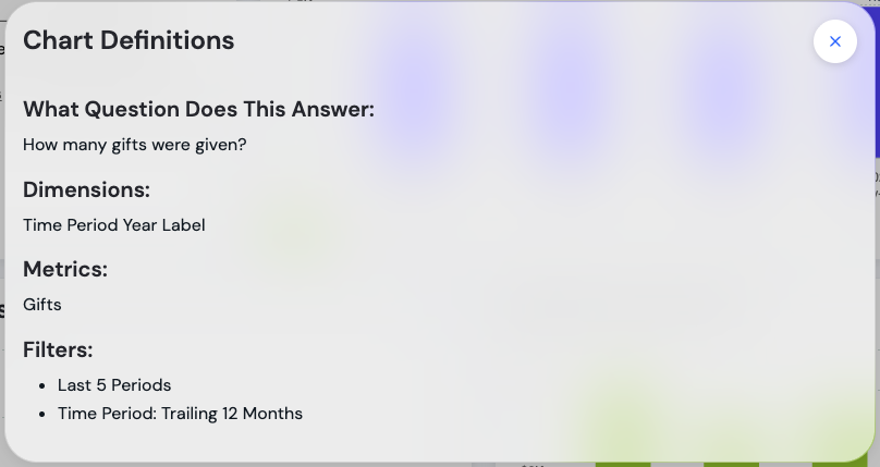 Shows the same chart definition details as the Dive Deeper button: question, description, dimensions, metrics, and filters.