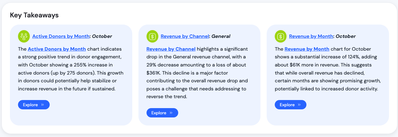 - Key Takeaways cards highlighting important stats like percent change, highest values, and notable trends.