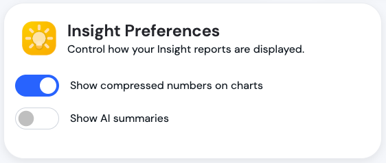 Setting What it does Default Show compressed numbers Abbreviates large values on charts (for example, 1.5K instead of 1,500). On Show AI summaries Displays Avid AI's-generated chart analysis on Insights pages. On - Changes save automatically and apply across all Insights pages.