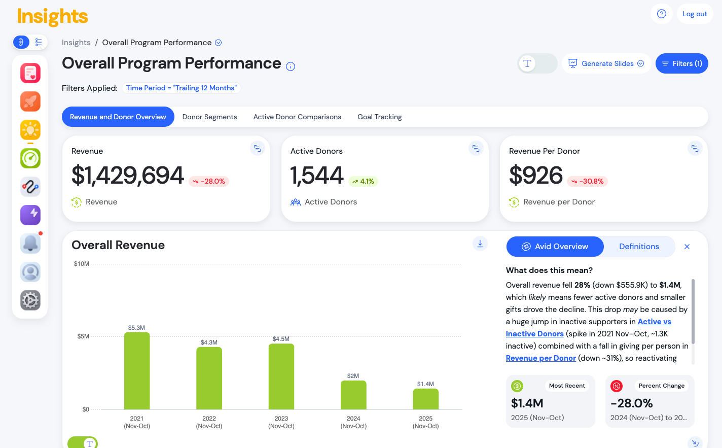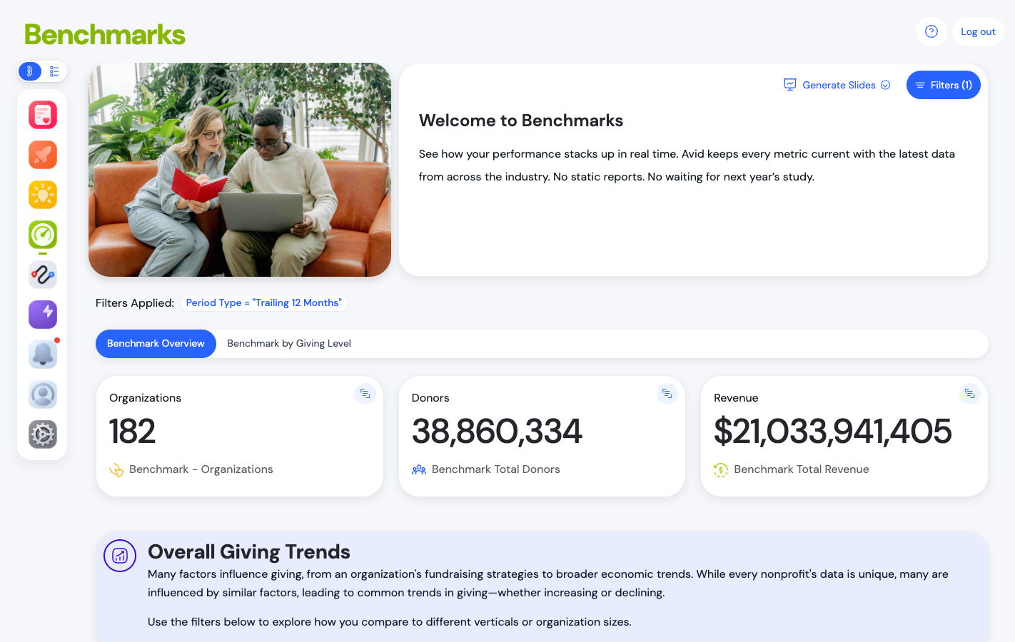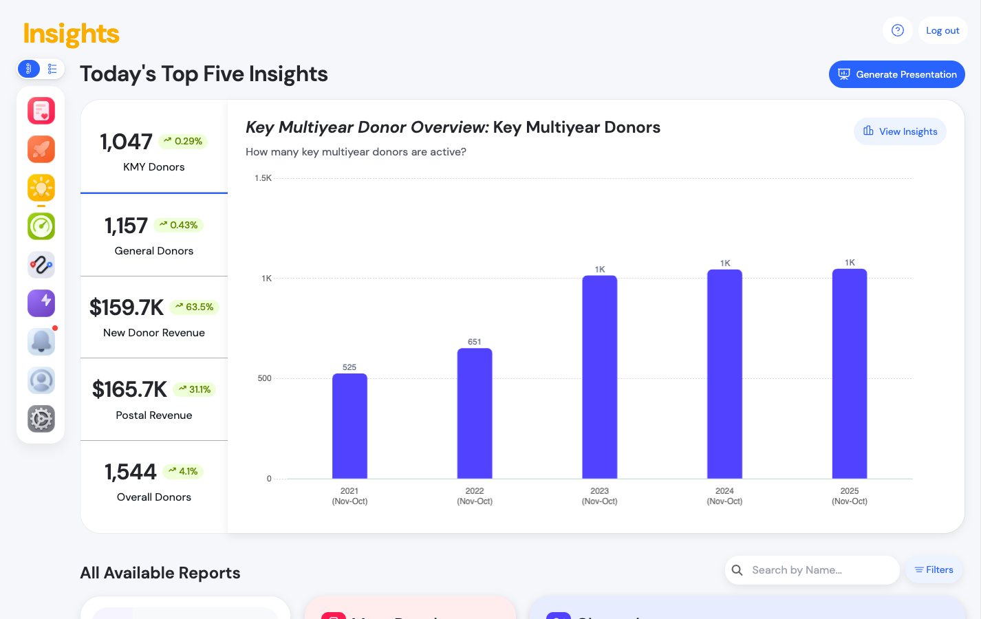 - All Available Reports organizes reports into thematic groups (such as Overall, Channels, Giving Levels, Lifecycles, and more) with search and filter controls to help you find the right report faster.