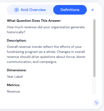 Size Description Small Compact view. Fits more charts on screen. Medium Default balanced view. Large Expanded chart with data labels shown automatically. Full Size Chart fills the page. Opens the Avid AI side panel with AI insights and definitions.