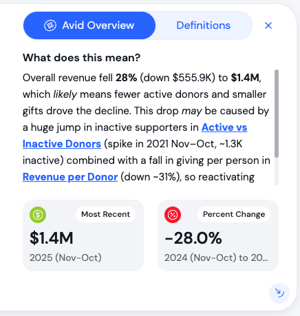 - An overview card shows your primary chart with an Avid AI summary and supporting metadata like last transaction date and current time period.